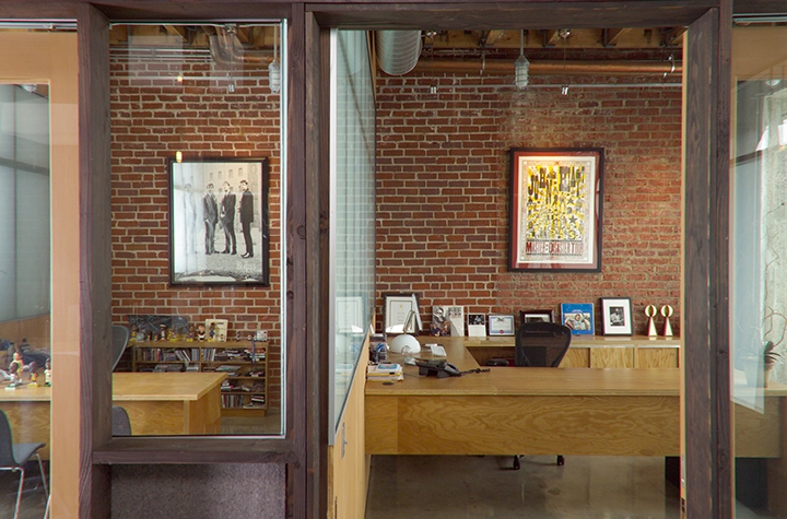 These headquarters for an independent record label consist of executive offices, open work space, meeting room, recording studio, tape archive, lunch area and kitchen. The roof was designed to have skylights with large acrylic boxes to diffuse the light into the space. The walls are open studs, stained dark brown. Felt is layered between the stud wall and exposed plywood sheathing. The felt gives the room texture, but also softens the acoustics. The company wanted a space that reflected their independent musical tastes and that distinguished themselves from the slick corporate record companies.