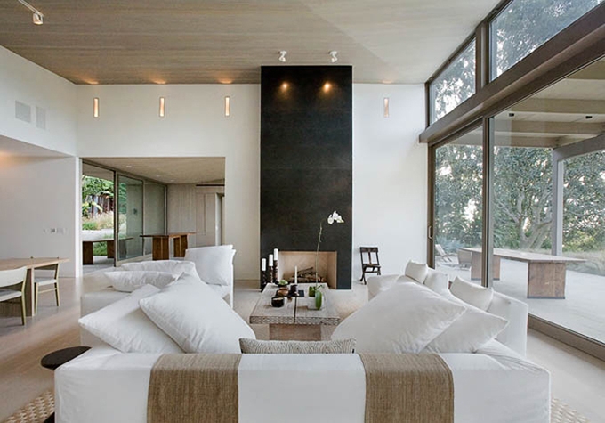 This new house located near the coast has views to the water and surrounding natural landscape. A muted palate of bleached oak, translucent glass, limestone, and "sea-glass" tile colors references this coastal site. The central living space is a loft-like open plan with the kitchen as the nexus. A library is loosely defined by casework and floating bookshelves off of the main living room. Large expanses of windows and sliding glass walls connect the interior to the surrounding landscape. Light is sculpted throughout the house to articulate the strong formal qualities of the architecture as well as to balance out the light from outside.